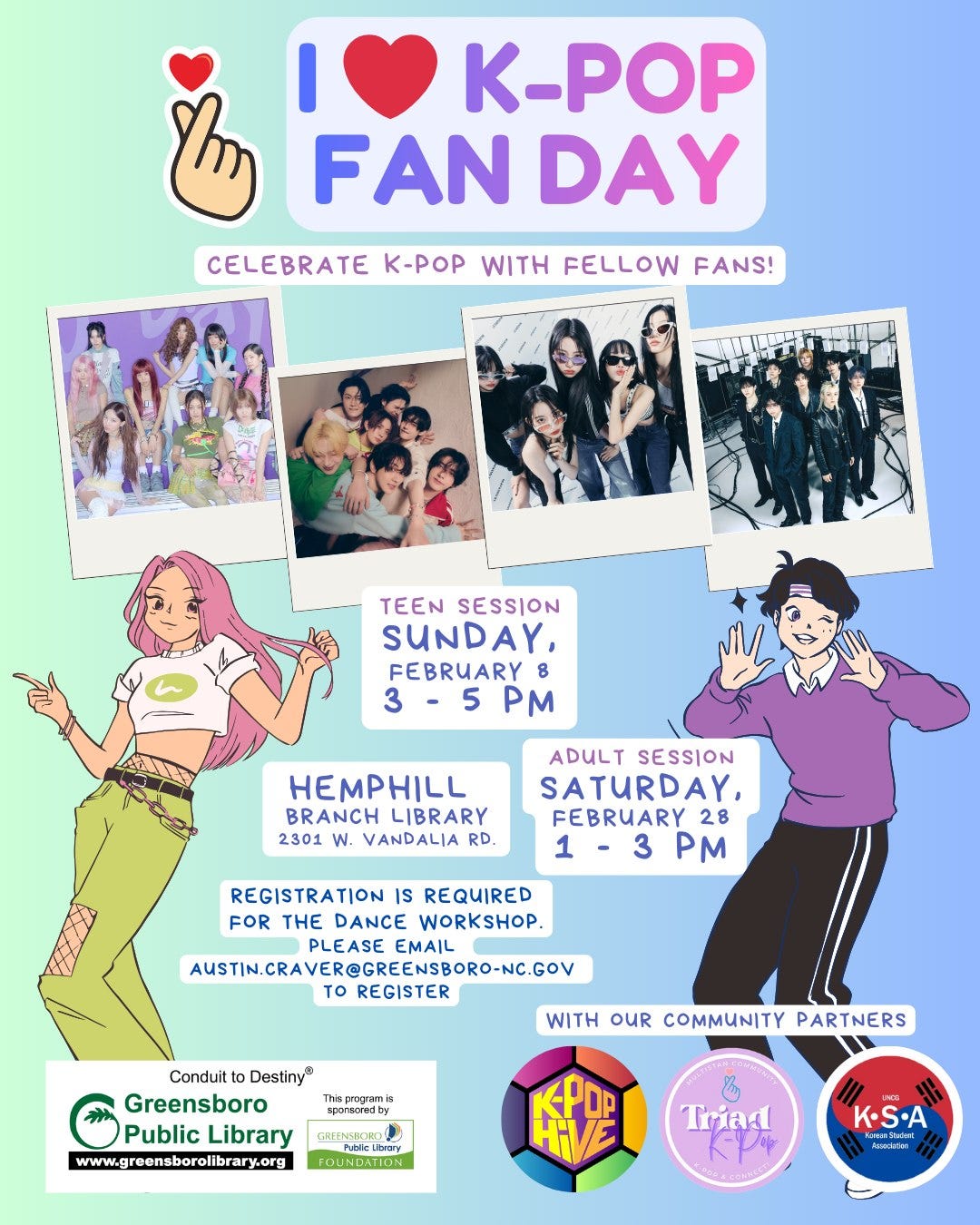 You are Invited to “I Love K-pop Fan Day” at the Greensboro Public Library (Hemphill Branch)! Entry is free but registration is required for the dance workshop led by KSA UNCG’s very own K-CODE! Triad K-pop and NC K-pop Hive will also be there to lead activities!